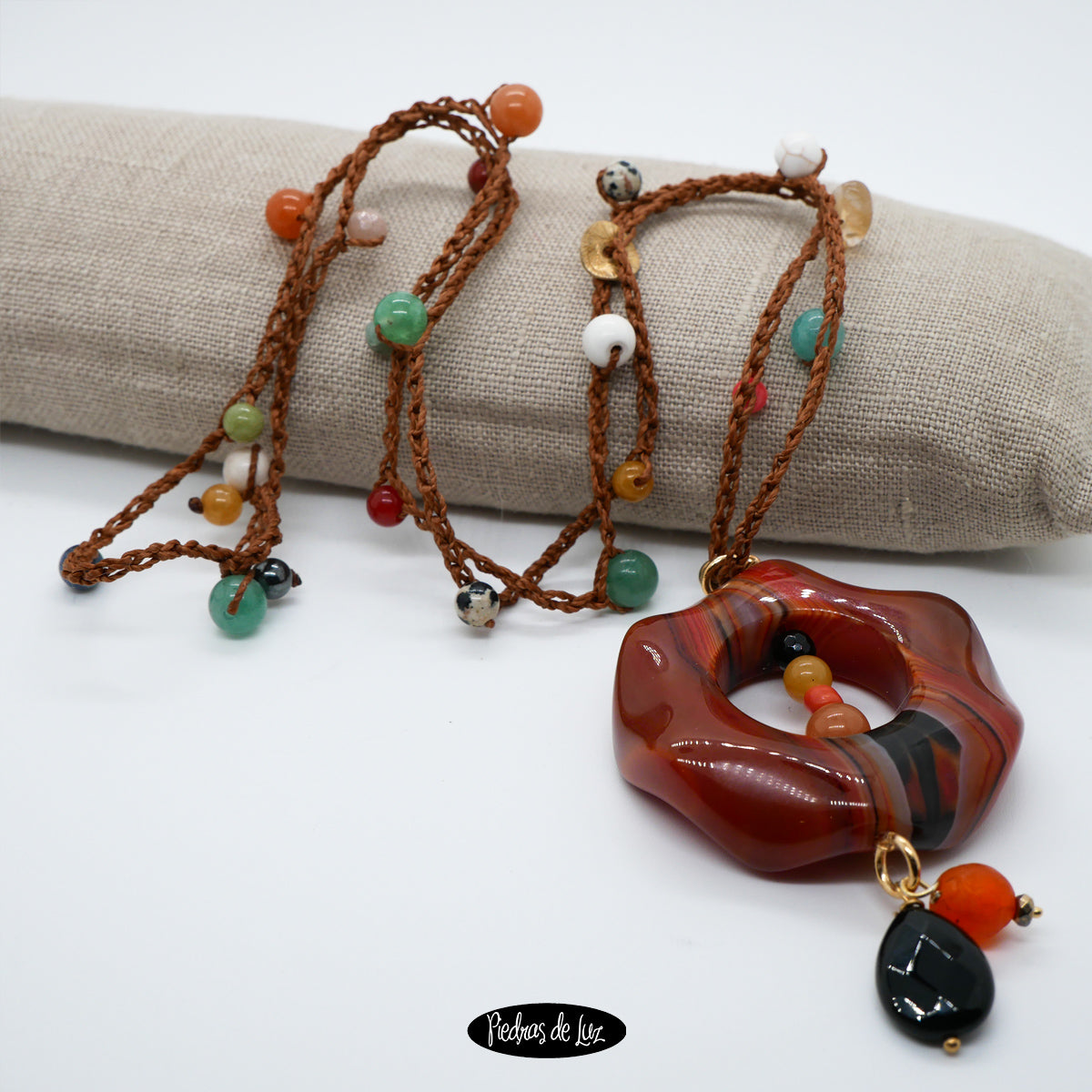 La pieza que cuelga es Ágata Naranja con colgantito de Ónix y Cristal africano .