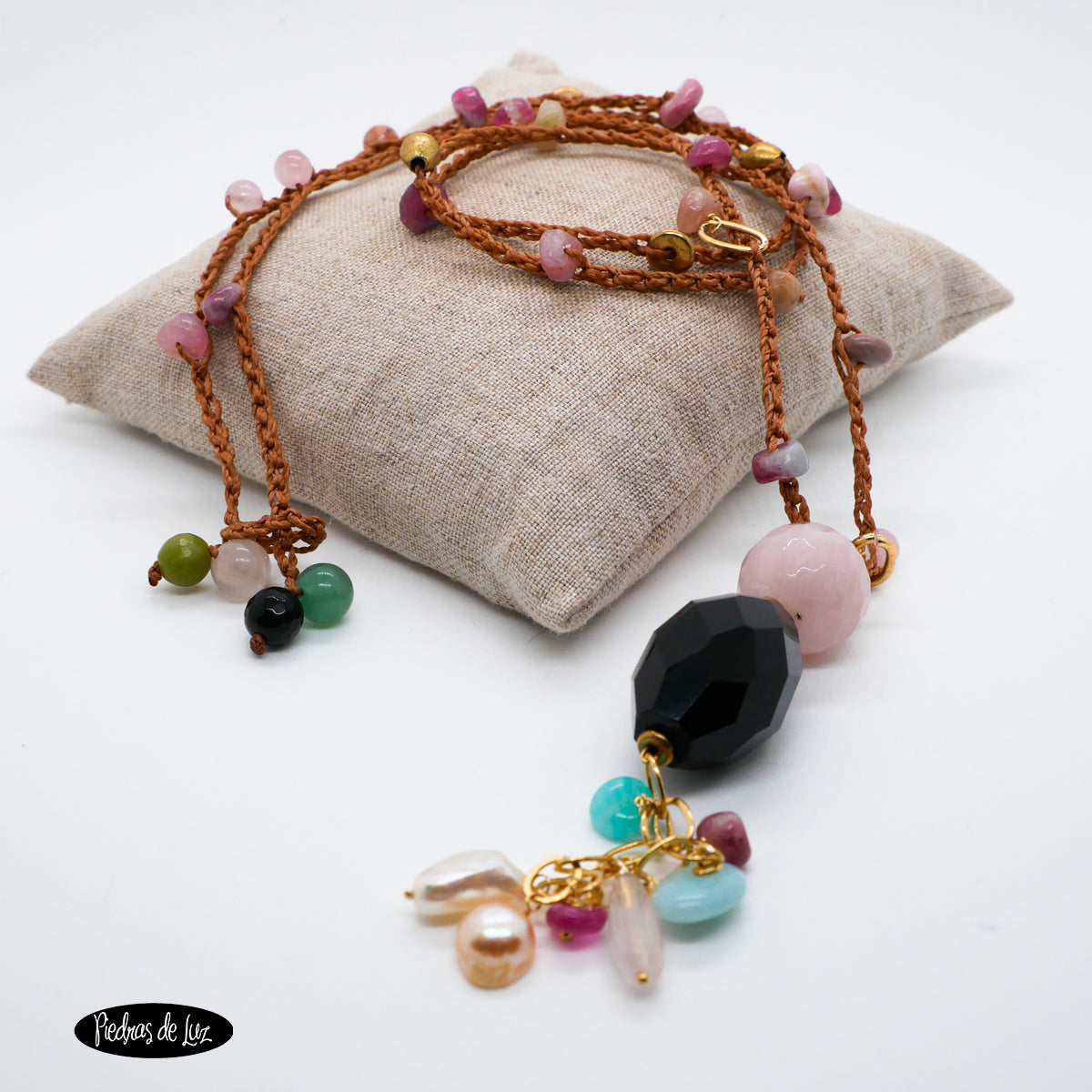 Colgante de 50cm, montado en hilo de algodón, piezas de aturmalina Rosa, Amazonita y perlas Naturales. Es un diseño único que te aportará abrazo y protección.