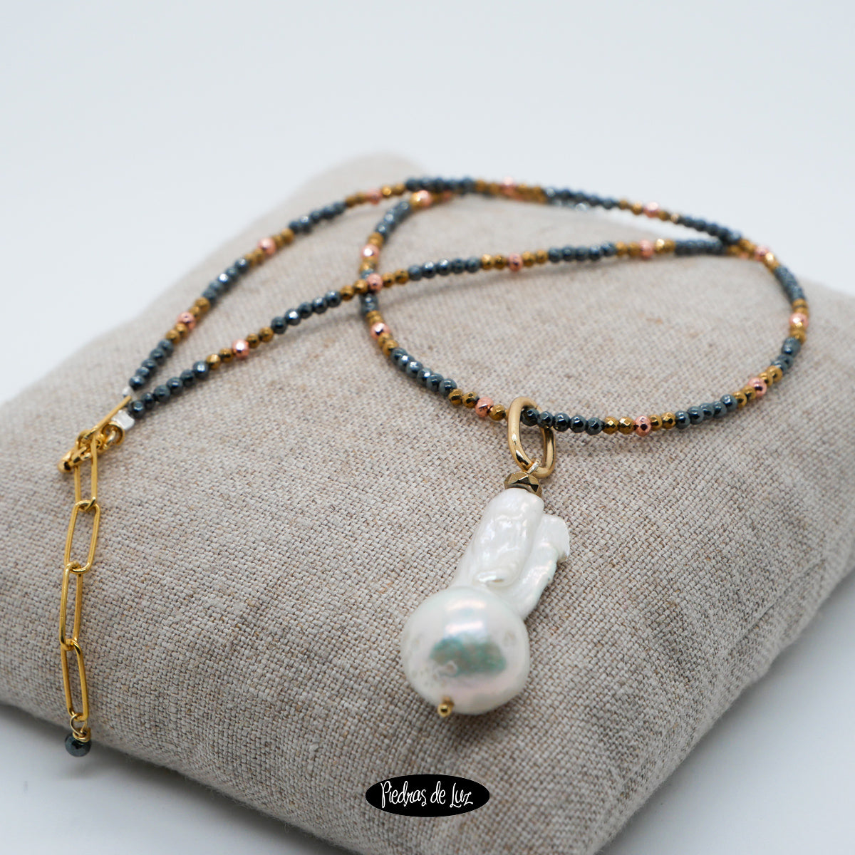 El Hematite es nuestro gran talisman de protección, le hemos puesto una pieza de perla que crea una joya especial y única llena de personalidad y brillo .